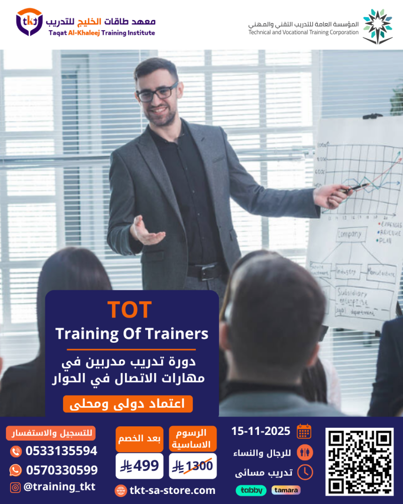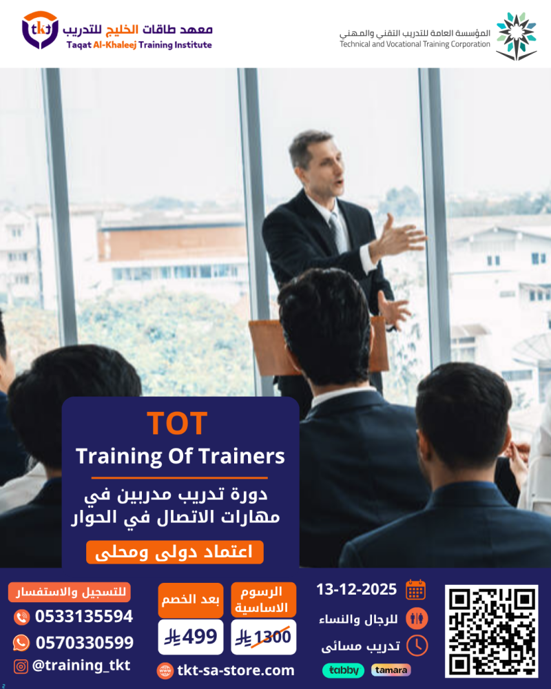 تقدّم دورة تدريب المدربين (Training of Trainers - TOT) المتخصصة في مهارات الاتصال، فرصة مميزة لإعداد وتأهيل المدربين لاكتساب المهارات الأساسية والاحترافية في التواصل مع المتدربين.